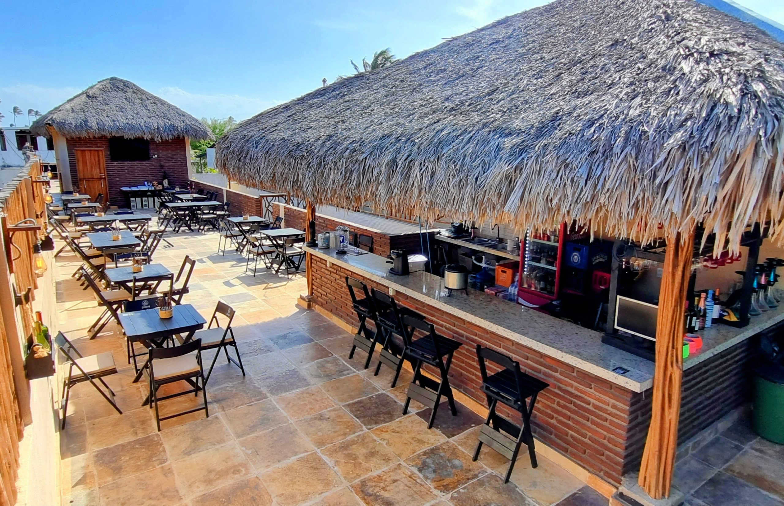 Área na areia, onde mesas na praia permitem observar o movimento da vila.